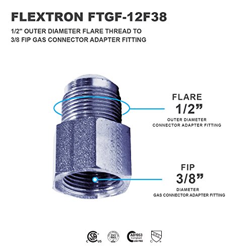 Flextron FTGF-12F38 Gas Connector Adpater Fitting with 1/2 Inch Outer Diameter Flare Thread x 3/8 Inch FIP, Uncoated Stainless Steel, for Dryer & Water Gas Connectors, Excellent Corrosion Resistance