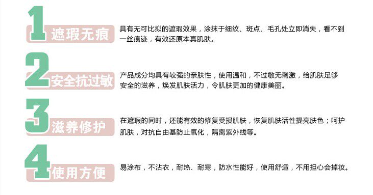 【使用方法】直接点涂于瑕疵上,瞬间遮盖,抚平瑕疵。