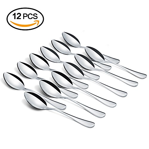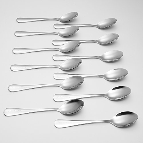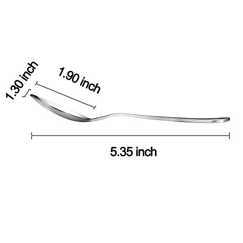 DIMENSION: 5.35 x 1.18 inches. Dishwasher-safe without harsh detergents, set contains 12 mirror finish stainless steel teaspoons. Pair with the forks under the ASIN number: B06XTJYB36. If you are looking for a set of teaspoon much smaller, you can consider the spoon set under the ASIN number: B06XTPYKNZ.