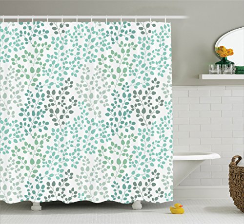 Green Shower Curtain House Decor by Ambesonne, Pattern with Leaf Branches Silhouette Nature Foliage Forest Decorative Image, Polyester Fabric Bathroom Set with Hooks, 75 Inches Long, Gray Teal Green
