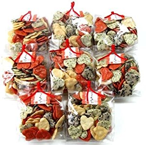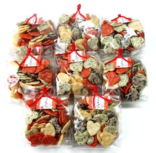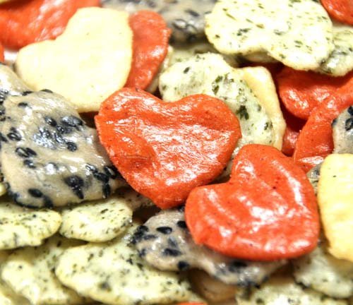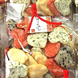 小さくてかわいいハート型のサラダ味のおせんべい。プレーン・胡麻・青のり・辛子、4種類のおせんべいが入ってます。