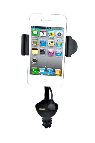 -. Feature : Universal In Car holder with Dual USB Charger w/ 2.1A output for fast charging / Strong grip to firmly hold your phone in any position / Extremely easy to place and remove the phone from the mount / Gooseneck for flexible angle. Can rotate 360 degree for any angel viewing. / Can charge other device through 2nd USB port