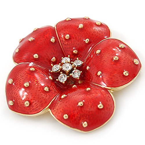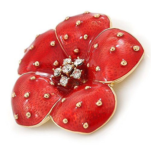 -. Title : Red Enamel, Crystal Poppy Flower Brooch In Gold Plating - 50mm D