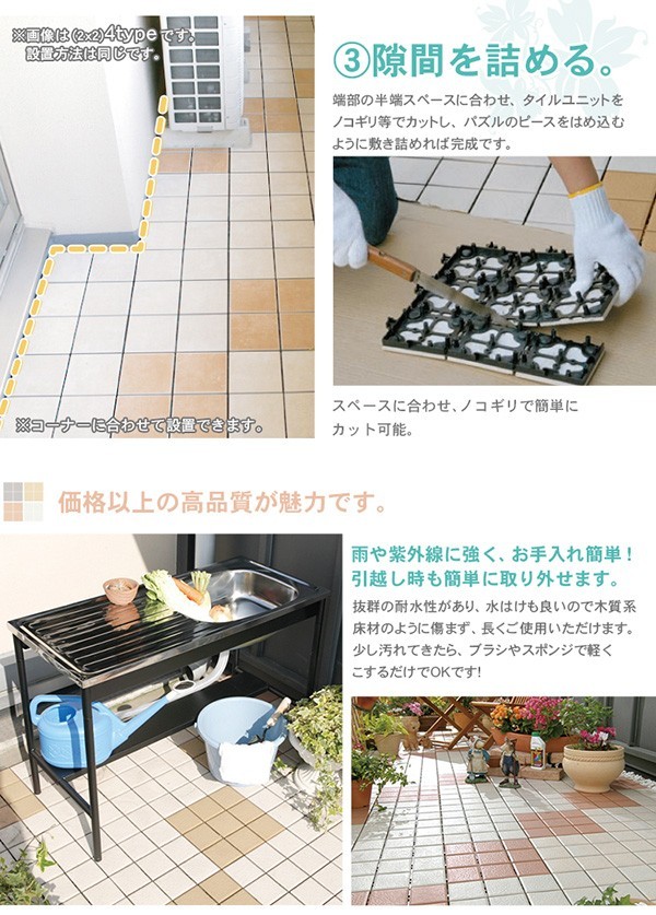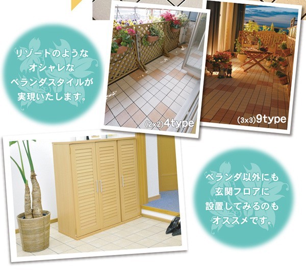 【商品について】【ベランダタイル】9枚タイルタイプ(40枚セット)■サイズ:(1枚あたり)幅30 X 奥行30 X 厚さ2.5cm10枚で約0.9平米の面積に敷設できます。1枚あたり1.7kg■カラー:ナッツ オフホワイト グレー ライトブラウン■素材:上部/陶器タイル ベース部/ポリエチレン・EVA樹脂【質感】 タイルはスベスベした質感になります。■その他:こちらの商品は完成品です。・梱包サイズ:(1梱包あたり)(約)約32x32x28cm(1.0才)※10枚入り・梱包重量:(約)18kg
