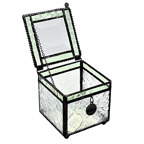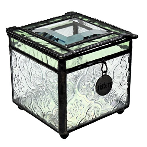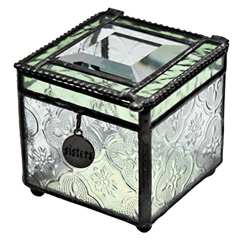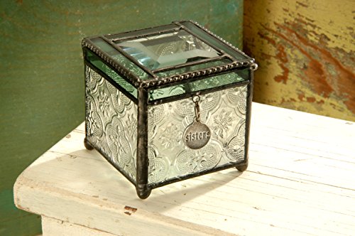 -. Feature : Charm inscribed with 'Sisters' is suspended on the front side of the jewelry box / This decorative box features a sage green trim, clear glass with an embossed vintage texture an iridescent glass in the bottom / A keepsake gift for your Sister / Handcrafted stained glass keepsake box made with lead free solder to protect you and the environment / Designed and Manufactured by J Devlin Glass Art 2.75"x2.75"x 3"