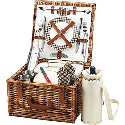 - Includes a premium picnic set with 8" ceramic plate s - matching cotton napkins - glass wine glasses - high quality stainless steel flatware - salt and pepper shakers