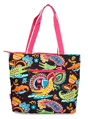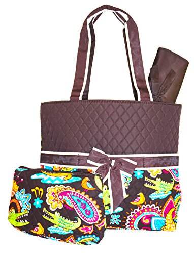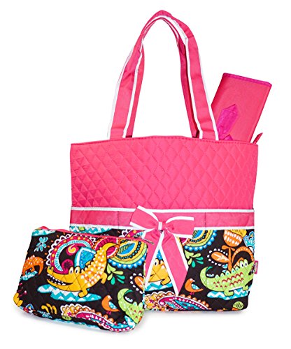 Let everyone know you're a fashion savvy mommy with this large 3 piece diaper bag with matching changing mat and cosmetic bag included. Prepare for your bundle of joy with this trendy carry all bag or buy for the perfect baby shower gift for any stylish mom to be. Travel anywhere confidently and fashionably with this all in one messenger for the chic mom on the go. Made of soft quilted cotton in a trendy print and cute ribbon detail, it features 3 exterior front pockets, 1 exterior zip pocket. All of baby's bottles and binkies will have a place with plenty of interior pockets to keep all that they need organized and at your fingertips. Zip top enclosure keeps Mom's essentials and personal items secure and easily accessible. Sturdy double handles make for easy carrying or are long enough to be slung over the shoulder. It's important to remain a stylish woman while still being a great mom and with this diaper bag, you can do both easily.Feature