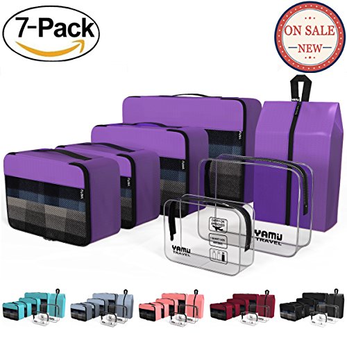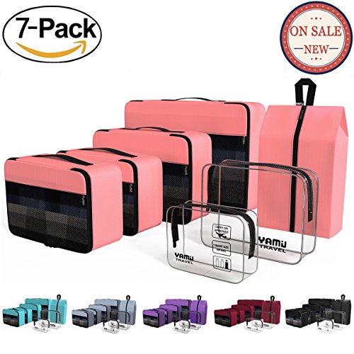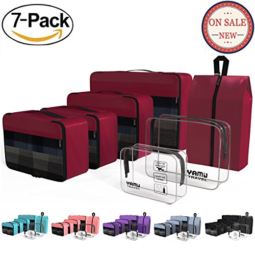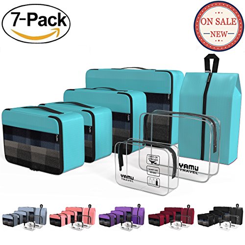 YAMIU Travel Packing Cubes: Perfect Travel Partner---YAMIU 7-Pcs design philosophy is to pack all your travel needs, like clothes, shoes, toiletries in a organized way and classify your dry/mid-wet stuff. Make packing a breeze and help a more wonderful journey!