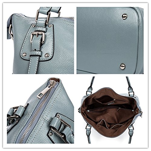 [Material]: High quality top layer cowhide leather with durable silver hardware, the bottom of handbag has four textured metal rivets which is effective for protection against wear. Dark brown interior polyester lining. Zippered opening closure.