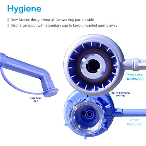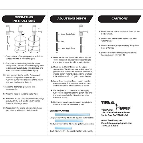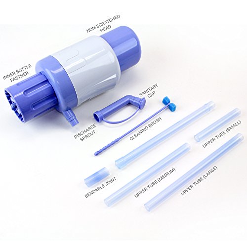 This manual drinking water pump is like no other. This model will fit onto any size bottle, screw-top or crown-top except glass bottles. It will have no problems fitting and pumping water from 2 gallon through 6 gallon water bottles. The new fastener system can grab onto and seal any bottle is a breeze. The new fastener was designed with hygiene in mind. Previous models have always had a bunch of ridges and rough areas that are safe havens for germs. The new design has all of these parts on the inside with a nice surface on the outside. Simply adjust your tubes according to the size of the bottle and tighten the pump onto the bottle. This pump will dispense water as fast as you can pump it and it will do it very well.Feature