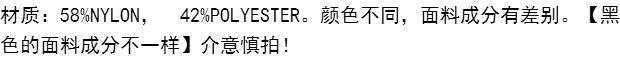 Material: 58% NYLON, 42% POLYESTER. Different colors, fabric composition is different. [Black fabric composition is not the same] mind carefully shot!
