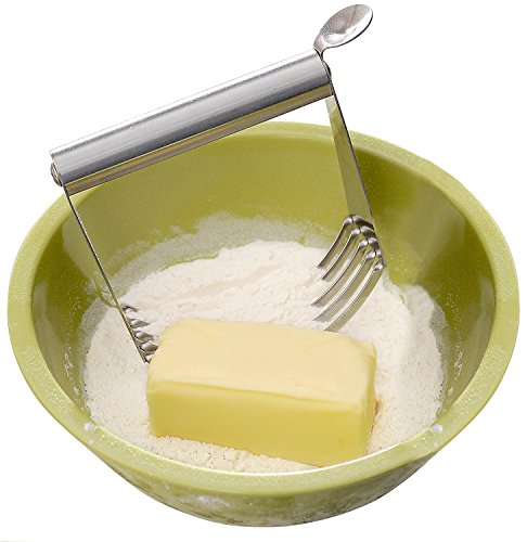Professional gauge stainless steel Pastry Blender is comfortable and easy to use. Features thumb rest and cuts through butter and shortening easily.