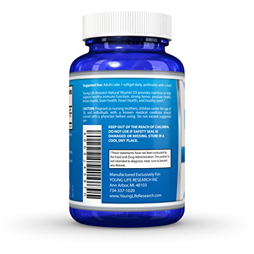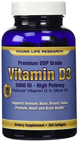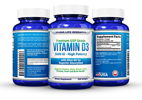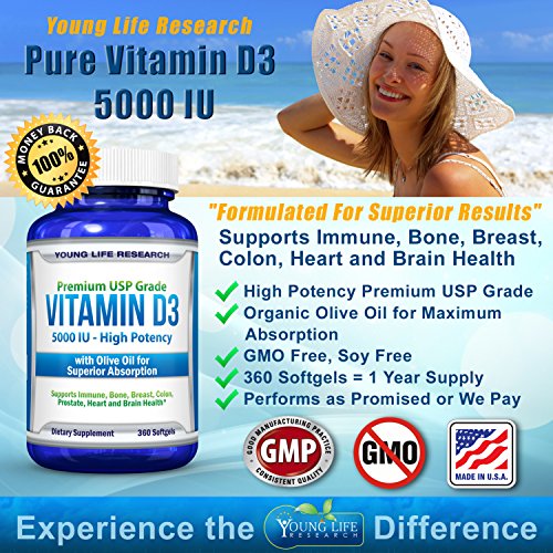 -. Feature : On Sale Today! - High potency premium USP Grade natural Vitamin D3 made from Lanolin plus Organic Extra Virgin Olive Oil for maximum absorption. 5000 iu per softgel, 360 softgels per bottle. / No GMO's, preservatives, artificial ingredients, or magnesium stearate. Free of soy, milk, gluten, eggs, peanuts, shellfish. Made in the USA in a GMP certified facility. / IS THIS A GOOD DEAL? We give you 360 mini softgels for a full 1 year supply! But more importantly, you're getting a product that will actually benefit you. / 100% MONEY BACK GUARANTEE - No hassle risk free 90 day guarantee. / Proven Health Benefits - Supports Immune, Bone, Breast, Colon, Heart and Brain Health.* According to Scientific American 75% of Americans are deficient in Vitamin D. Try it out now and experience the Young Life Research difference!