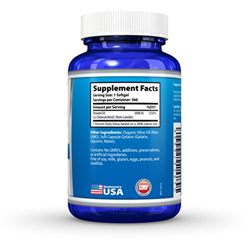 -. Title : Vitamin D3 5000 IU - In Non GMO Organic Olive Oil - Powerful Health Benefits - 360 Softgels