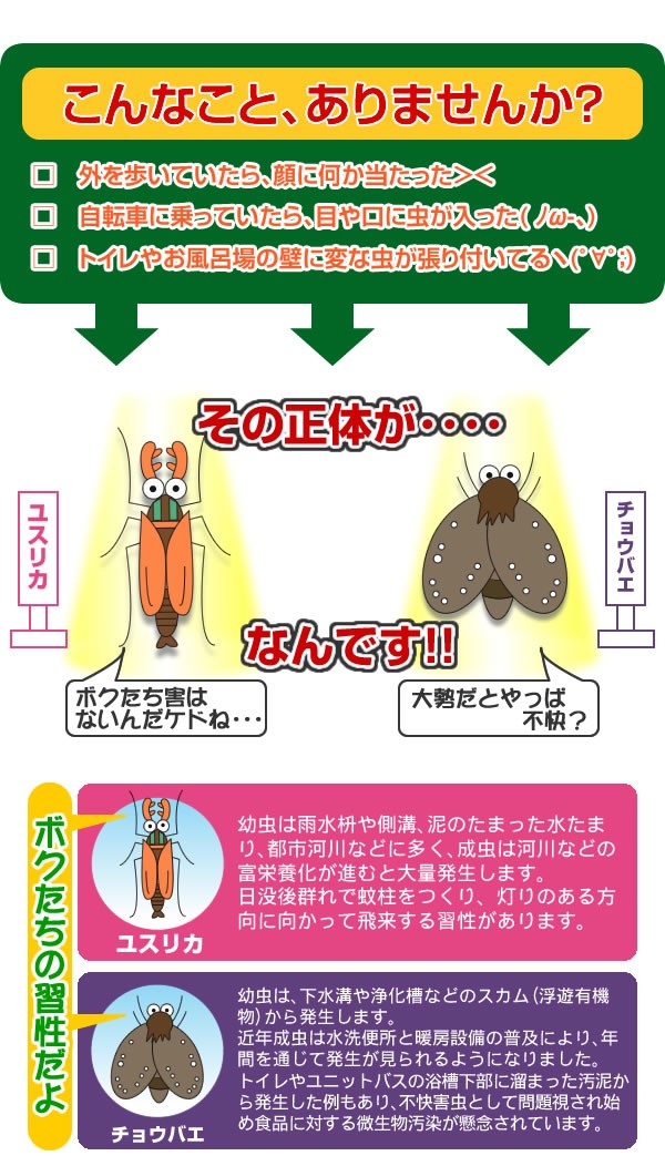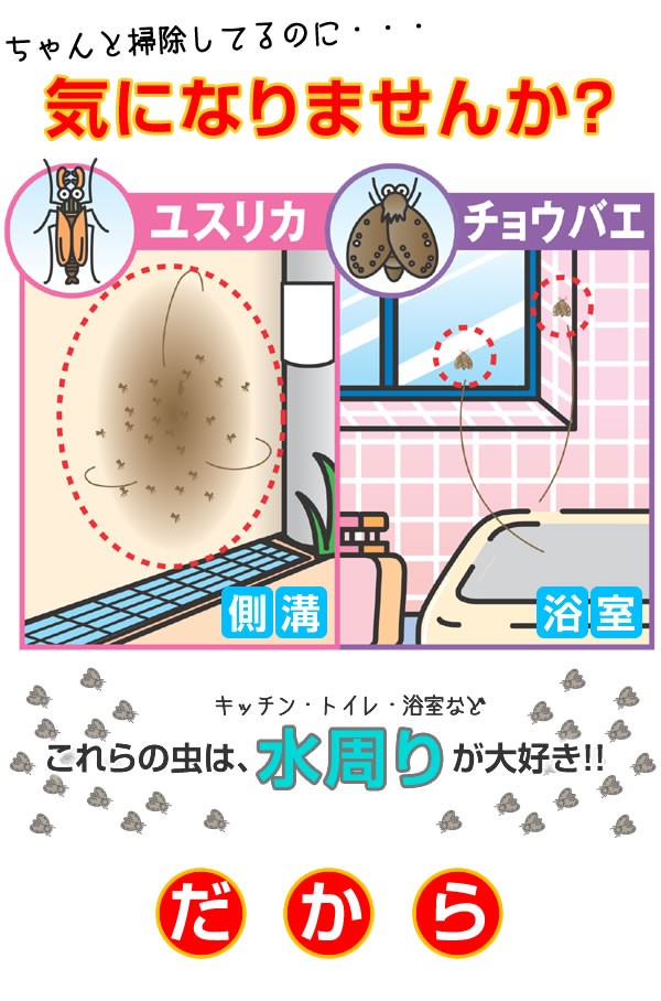 <h1>キッチン・トイレ・洗面所・ユニットバス・お風呂場・雨水枡などにわく、ユスリカ・チョウバエなどの害虫駆除に!< /font></h1>