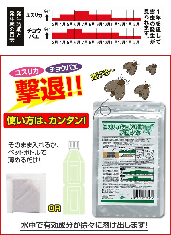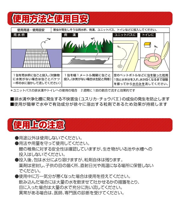 大量発生する前に!溝・浴室などにわく小さな虫(ユスリカ・チョウバエ)に困っていませんか?対象域にそのまま投入するだけで、ユスリカ・チョウバエの発生を抑えます。有効成分が徐々に溶出するので効果が長持ち(約1~2ヶ月)!各地方自治体の一部で採用されている薬剤です。
