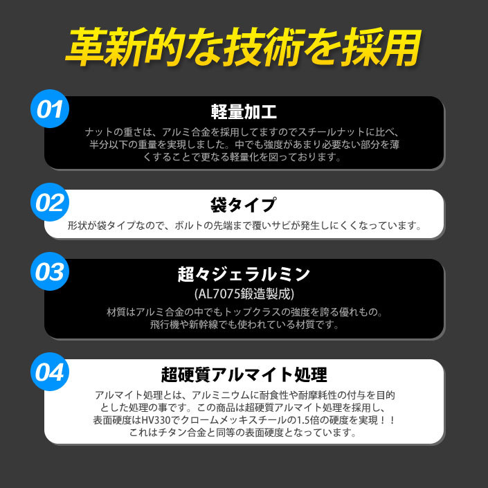 ●ナットの重さは、アルミ合金を採用してますのでスチールナットと比べ半分以下の重量を実現しました。