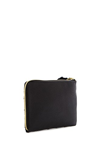 -. Feature : Sequin Stripe Faux Leather Faux Fur Pom Pom Pouch is constructed of faux leather with black sequin stripe & faux fur pom pom detail / Zip around closure - Exterior features 1 detachable faux fur pompom attachment - / Interior features padded compartment / Approx. 7" H x 9.5" W x 1" D - Approx. 6" strap drop
