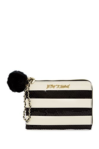 -. Title : Betsey Johnson Sequin Stripe Black Whiter Faux Leather Faux Fur Pom Pom Pouch Wristlet Handbag