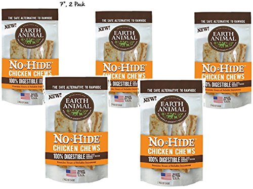 -. Feature : 10 Total (5 Packs with 2 per pack) Earth Animal No-Hide Chicken Chew 7 Inches / Holy Cow, We did it! At last, a safer, healthier, better alternative to Rawhide. / Our No-Hide Chicken Chew is a long-lasting, 100% digestible chew, created for your dog's enjoyment and your own peace of mind. / No-Hide Chicken Chews give new meaning to dog chews. Try the safer, healthier alternative today! / 100% Digestible Safe and Nutritious Durable, Long-Lasting Chew Promotes Healthy Teeth and Gums Made with Real American Farm-Raised Chicken Manufactured in our USDA Inspected Human Food Facility No Chemicals or Additives.
