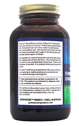 -. LegalDisclaimer : Dr. Weston A. P.R.Ice discovered High Vitamin Butter Oil in the 1930's. The pinnacle of his X-Factor discovery was the extreme synergistic effect between High Vitamin Butter Oil and traditional cod liver oil. "One without the other did not do his patients justice, but the two together worked like magic". X-Factor GoldTM High Vitamin Butter Oil is made from dairy oil extracted without heat from cows that eat 100% rapidly growing grass. The speed of the grass growth, timing of the grazing of this grass, species of grass, climate and extraction method are all important to make real X-Factor GoldTM High Vitamin Butter Oil. The Blue IceTM Fermented Cod Liver Oil brings us back in time, when cod liver oil was truly a sacred food. The Blue IceTM Fermented Cod Liver Oil is lacto-fermented and extracted without heat. The fish are wild caught in the Arctic region. The combination of these attributes provides our community with a pure, clean and nutrient rich sacred food. Blue IceTM Royal offers our community a nutrient dense sacred food blend of 1/3 X-Factor GoldTM High Vitamin Butter Oil and 2/3 Blue IceTM Fermented Cod Liver Oil.