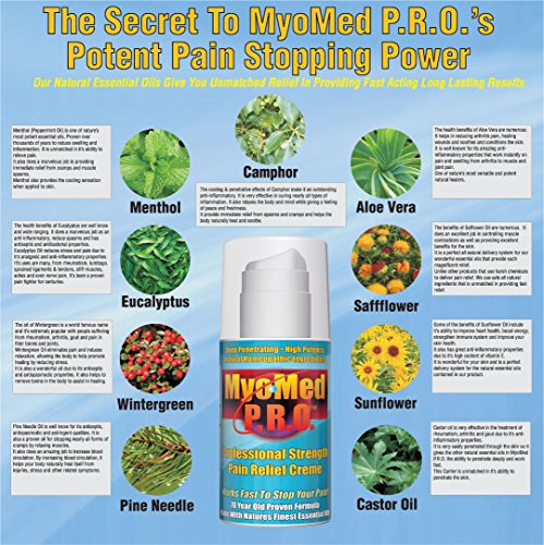 - Feature : ► FAST SHINGLES VIRUS RELIEF- MyoMed P.R.O. contains NINE clinically proven pain fighting ingredients are a safe and highly effective OTC shingles rash medication. Get long lasting pain relief remedy in minutes. This shingles cream formula stops the severe pain and itching fast. / ► FAST BRUISE RELIEF - Outstanding treatment stops pain from bruises. The fast acting cream penetrates deeply to relieve the source of your discomfort. Bruises heal & disappear quickly. Works better than Arnica cream, msm cream and capsaicin. Much safer than DMSO & NSAID cream. / ► EASY & CONVENIENT TO USE - Airless pump dispenser makes applying our potent & concentrated topical skin cream easy to use for adults and children. No product contamination risk. Use for all types of pain symptoms. Use before and after workout to treat aches and strains. Can be used with ultrasound machine, tens unit, achilles tendonitis brace, tennis elbow brace and any type of support brace. / ► WORKS ON ALL TYPES OF PAIN - It's The Best Pain Relief management and chosen worldwide for long lasting relief by Sufferers of Shingles, Bruises, Golf And Tennis Elbow, Carpal Tunnel Syndrome, Tendonitis, Bursitis, Shin Splints, ANY TYPE OF MUSCULAR, SORE JOINT PAIN, SWELLING & INFLAMMATION! / ► MADE IN THE USA - Our Professional Strength Pain Relief Cream Is Made In An FDA Approved Lab. Your Myomed Purchase & Satisfaction Is 100% Unconditionally Covered By Our "Fast Relief Guarantee". No Questions Asked! No Time Limit! EVER!
