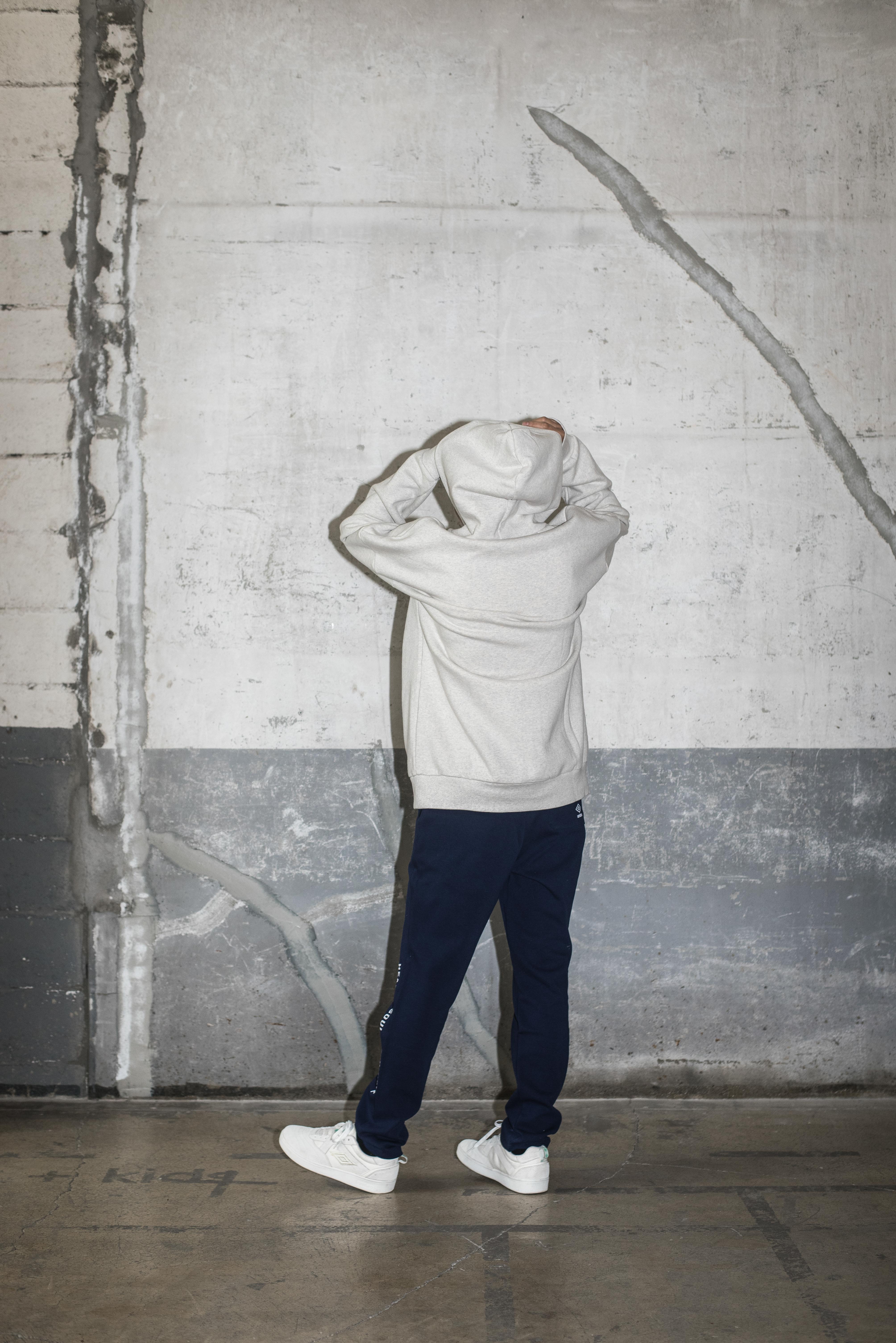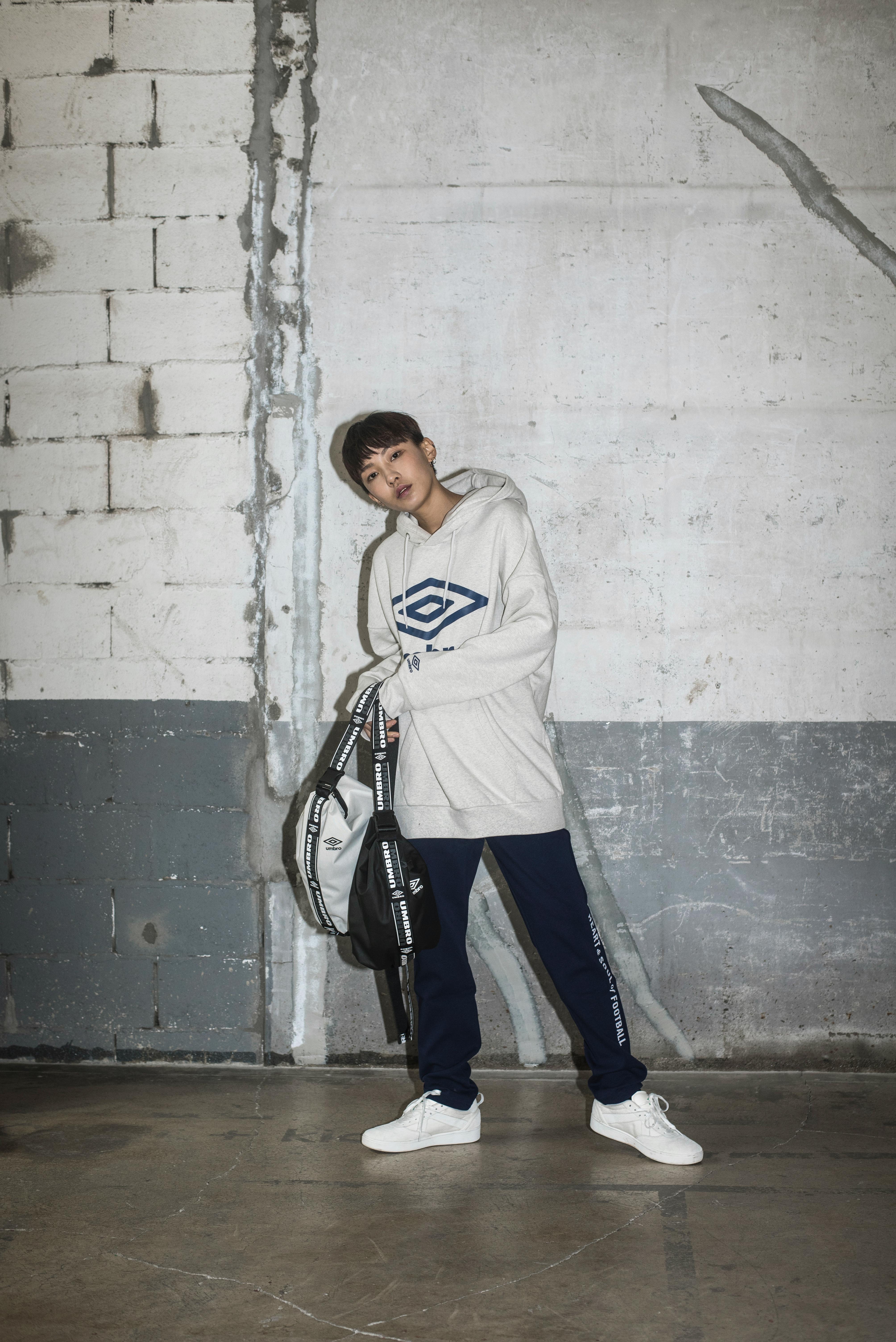 왼쪽 하단 엄브로의 슬로건 프린트가 포인트인 슬림핏 팬츠입니다