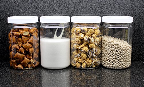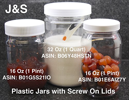 J&S - 32 Oz Plastic Jars with Screw On Lids - 4 Pack - Clear BPA Free PET Quart Sized Storage Containers with White Sealing Caps
