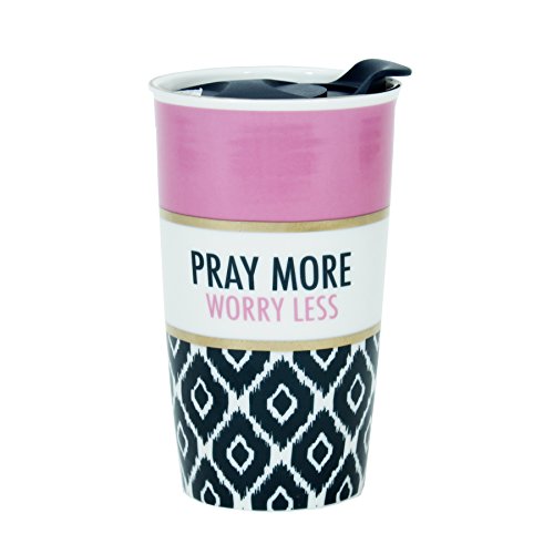 Pray More Worry Less Ikat and Pink 13 Oz. Ceramic Gold Tones Tumbler Mug with Lid