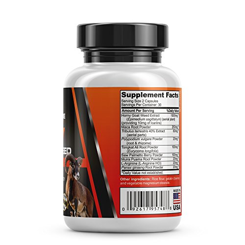Studio : Johnson Brand LLC Publisher : Johnson Brand LLC Binding : Health and Beauty Product Description Powerful 9 Herb Blend! Contains 1000mg. of Horny Goat Weed Extract (Ephimedium sagittatum) providing 10mg of Icariins * 250 mg of Maca root Poweder * 60mg of Tribulus terrestris * 20 mg of Polypodium vulgare Powder * 100 mg of Tongkat Ali Root Powder * 100 mg Saw Palmetto Berry Powder * 20 mg of Muira Puama * 20 mg of L-Arginine * 20 mg Panax ginseng * Male Female Compatible * GMO FREE * MADE IN USA in a FDA and GMP Certified Facility. This is a more natural alternative to the Prescription Drugs to help: Stimulate sexual desire in men and women Boost Testerone Boosts libido Improves sexual energy and stamina Support sexual performance Natural and Safe Aphrodisiac Ingredients For centuries Horny Goat Weed has been used as a natural aphrodisiac to help men and women. Research data supports Horny Goat Weed extract containing Icariins is an effective supplement to help boost desire, stamina, and sexual energy. Maca Root Powder, Tongkat Ali Powder and Muira Root Powder ("potency wood") are all well known traditional ingredients in medicines and supplements designed to enhance the libido and provide a natural sexual performance boost. 0