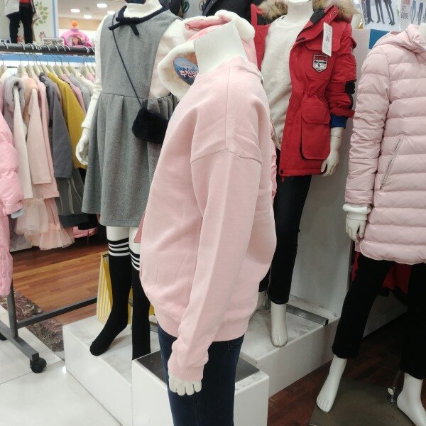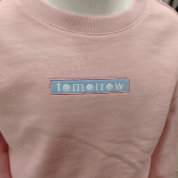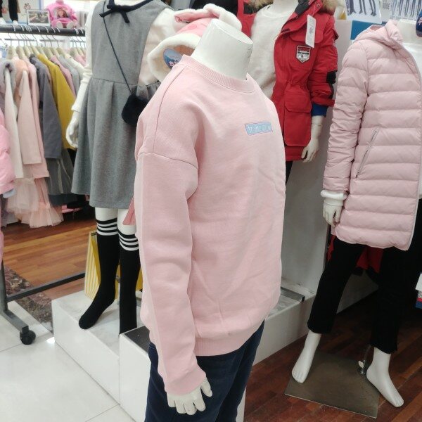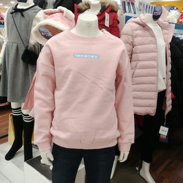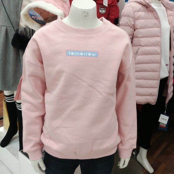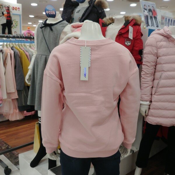 얇은기모 맨투맨 티셔츠입니다.라이트 핑크에 매우 단순한 로고 포인트가 전부입니다.여학생 전용입니다.