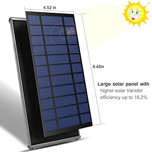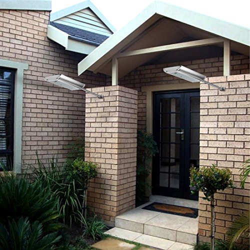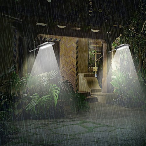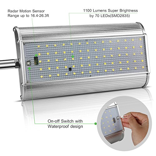 -. Feature : 5 Modes: 1.High light when people come, turns to dim light after people leave 15 seconds. 2. High light when people come, light off after people leave 15 seconds. 3. Always lighting mode. 4. Intelligent Mode. 5. One Hour Lasting Highlight. / Large Solar Panel: Provides up to 18.2% solar transfer rate. 3.7V 6000Mah big capacity make it more durable for long time lighting even in bad weather that lack of sunshine. / Waterproof & Heatproof: IP65 waterproof design and aluminum case is sturdy enough to against water, corrosion and overheat, which enable it looks great and works last for over 10 years. / 70 Super Bright LED: Emit over 1100 lumen brightness to light up and secure to your house. Ideal of being used in garden, pool, patio, garage, driveway, stairs, outside wall etc. / Aluminum Mounting Pole: Easily installs in seconds, 16 Inch heavy duty pole helps extending your solar light out from the eave to receive sunshine directly.