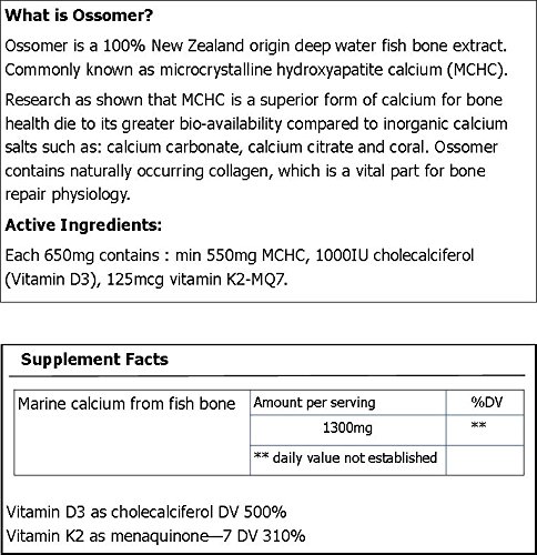-. Feature : Standard dose = 2 capsules daily - Check with health professional if using blood thinners. / Most tolerated form of calcium. Most absorbable form of calcium. Made from Raw Deep Water Fish Bones -Not Decomposed Calcium Salts / MCHC is microcrystqalline hydroxyapatite calcium, the most natural form of calcium / Ossomer is complete and balanced- Calcium, Phosphorous, Magnesium, Collagen, Vitamin K2-MQ7 and Vitamin D3 / Supplies natural calcium and activates proteins to take calcium to our bones while removing calcium from our bloodstreams