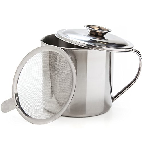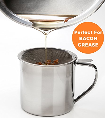 GET A HANDLE ON YOUR BACON GREASE. This 1.25 quart or 5 cups cooking oil and bacon grease container with strainer can be used as a grease separator, cooking oil dispenser, grease canister with strainer, grease strainer and container and a grease keeper with strainer. ENJOY COOKING EVEN MORE or get your money back. With the 30 day money back guarantee with 1 year free replacement warranty, leaks or breaking handles are a worry of the past. Add to cart now! 0 |