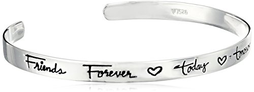 Celebrate your friendship on any occasion with the gift of the Sterling Silver "Friends Forever Today Tomorrow Always" Cuff Bracelet. This classic 925 sterling silver cuff boasts dark engravings that spell out the words, Friends, Forever, Today, Tomorrow, Always. Each word is interrupted with a cheerful open-heart shape. A wonderful way to showcase a life-long friendship.