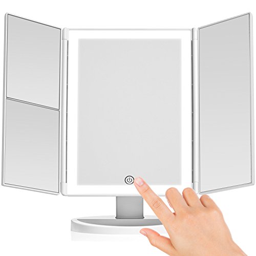 Lighted Makeup Mirror Vanity Mirror with Lights, Touch Screen Dimming, Tri-Fold 1x 2x 3x Magnification Sections, Portable High Definition Clarity Cosmetic Light Up Magnifying Mirror