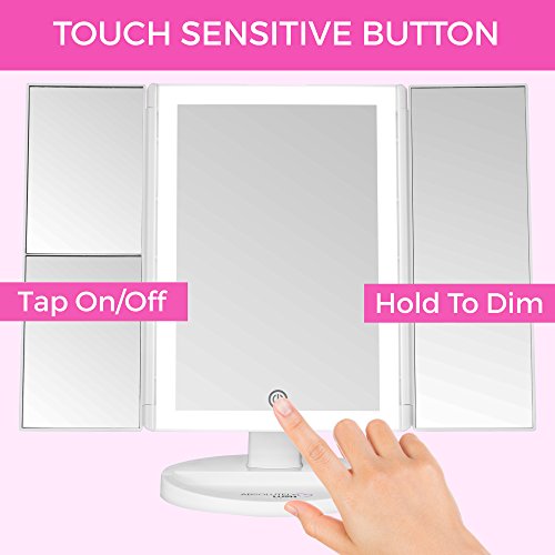 - THE COSMETIC TOUCH - Dimmable touch screen LED lighted makeup mirror with lights that dim as you press and hold your finger on the touch sensitive button to help you get exactly the right amount of 'natural daylight replicating' light to touch-up your makeup or apply fake lashes.