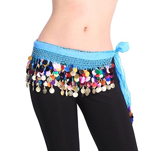 Feature : Wrap measures 59 inch, length which fits slim to 29 inch waists / Material: Chiffon,Alloy,Sequins / The belly dancing belt creates loud and lovely sound when the dancers move and shakes hip / This scarf is a great addition to your dance workout,Express your inner power, beauty and feminity in this belly dance costume / Perfect for dance shows. partying with friends or even a girls night out at your local international bistro