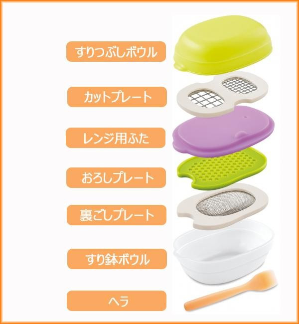 | セット内容 | すりつぶしボウル・カットプレート・レンジ用フタ・おろしプレート・裏ごしプレート・すり鉢ボウル・ヘラ・愛情満点レシピ |