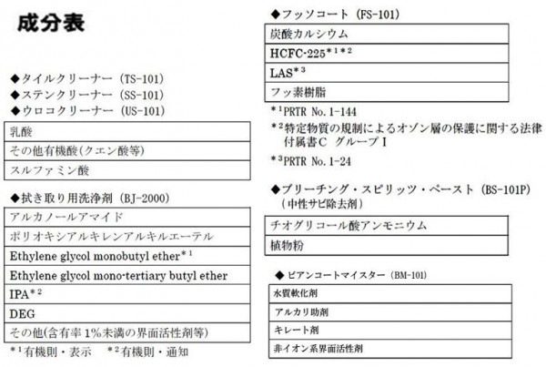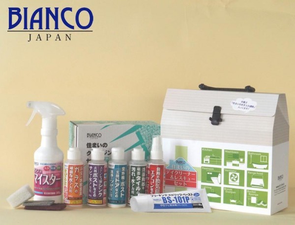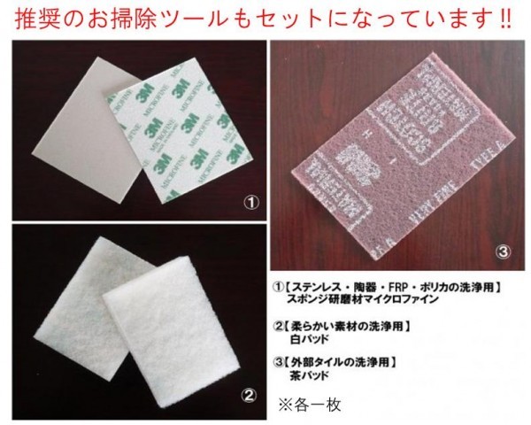 | セット内容 | ・ステンクリーナー100g ・タイルクリーナー100g ・ビアンコマイスター300g ・ブリーチング・スピリッツ・ペースト80g ・拭き取り用洗浄剤100g ・ウロコクリーナー100g ・フッソコート80g ・スポンジ研磨剤マイクロファイン1枚 ・スコッチブライト茶・白パッド各1枚 ・製品使用方法DVD1枚 ・製品使用方法のご案内1部 ・住まいのお手入れ講座の冊子 |