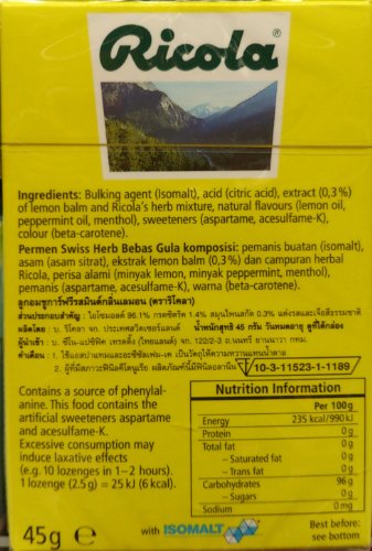 Studio : RICOLA(27) Publisher : RICOLA(27) Binding : Grocery Product Description Refreshing lemon mint mouthwateringly good Swiss herbal sweets Ricola: Great tasting, long lasting, mouthwatering refreshment. The secret behind Ricola's great taste is the famous mix of 13 herbs - naturally cultivated in the fresh pure air of the beautiful and tranquil Swiss mountains. Factory Made in a nutfree environment Sugar free 0