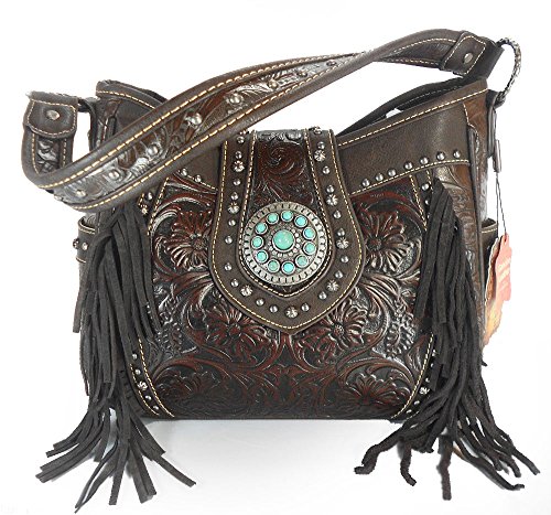 -. Title : Trinity Ranch Concealed Gun Carry, Tooled Leather & Fringe Hobo- Coffee