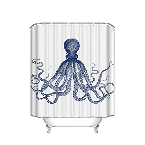 Shower Curtain Octopus Decor , Sea Creatures Nautical Blue, Polyester Fabric Bathroom Set with Hooks, 69 x 70 Inches Long, Blue