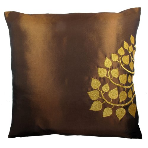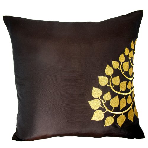 Contemporary Thai Silk Throw Pillow Cover (Cushion Cover), Gold Embroidered Bodhi Tree Leaves Design, 16" x 16", Dark Brown