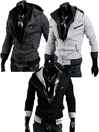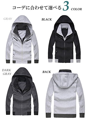 -. Feature : 【カラー】 ブラック/ダークグレー/ライトグレー (3 カラー) / 【M】バスト約98cm 丈約66cm 肩幅約43cm 袖丈約63cm【L】バスト約104cm 丈約68cm 肩幅約45cm 袖丈約64cm【XL】バスト約110cm 丈約70cm 肩幅約47cm 袖丈約65cm【XXL】バスト約114cm 丈約72cm 肩幅約49cm 袖丈約66cm / 春・秋にはアウターとして、冬にはインナーとして大活躍の1着です。3シーズン着まわせるフード付きパーカーです。着心地の良い生地のスタイリッシュパーカー。オシャレ男子必須アイテム 着心地が良いので部屋着としてもいかがでしょうか。 / デザイン上タイトな仕上がりになっています。通常サイズのワンサイズ、またはツーサイズ上をお選び下さい。 / 細身できれいめなシルエット。これ一枚でさまになるオシャレアイテムです。ダブルフロントデザインは重ね着風の着こなしが1枚で手に入るお得アイテムです。 襟は立てても開けてもOK。 胸元の左右のファスナーがcoolでかっこいい! 美しいシルエットのスタイリッシュなデザインです。これからの季節にピッタリの重ね着風パーカージャケットです。オールシーズン使えるゆったりお洒落な前開きアメカジストリートパーカーです。1枚でお洒落なコーディネイトが完成します。ダブルジップでしっかり防寒できます。着心地の良い素材です。タイト目でシルエットもすっきりします。