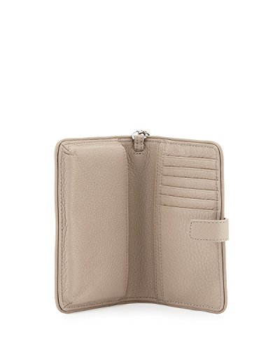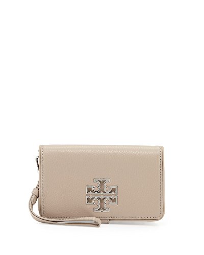 Binding : Apparel Product Description Tory Burch pebbled leather smartphone wallet. Removable wristlet strap. Snap strap closure. Double-T logo at front center. Inside: six card slots; smartphone slot. Outside: back zip pocket with logo lining. 4"H x 6"W x 1.3"W. 0