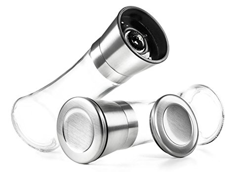 Modern ans Unique: Stainless Steel and Glass Salt and Pepper Grinder Set - Simple design with no logos or branding that will look elegant and smart on your table at all times and charm your family and guests.