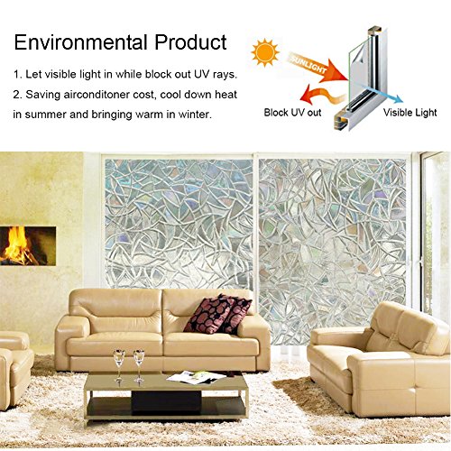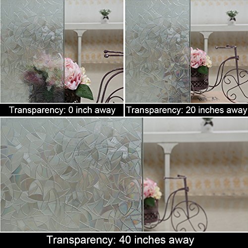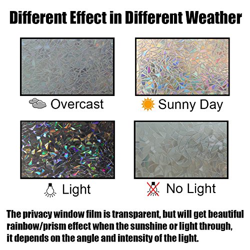 - Privacy Protection Window Film & Rainbow/Prism Effect: Provides privacy and allows the lights in. 40 inches away, the protection of privacy effect ≥95% (Great privacy protection, applicable for most cases but not recommended for bathroom application). The privacy window film is transparent, but will get beautiful rainbow/prism effect when the sunshine or light through, it depends on the angle and intensity of the light.