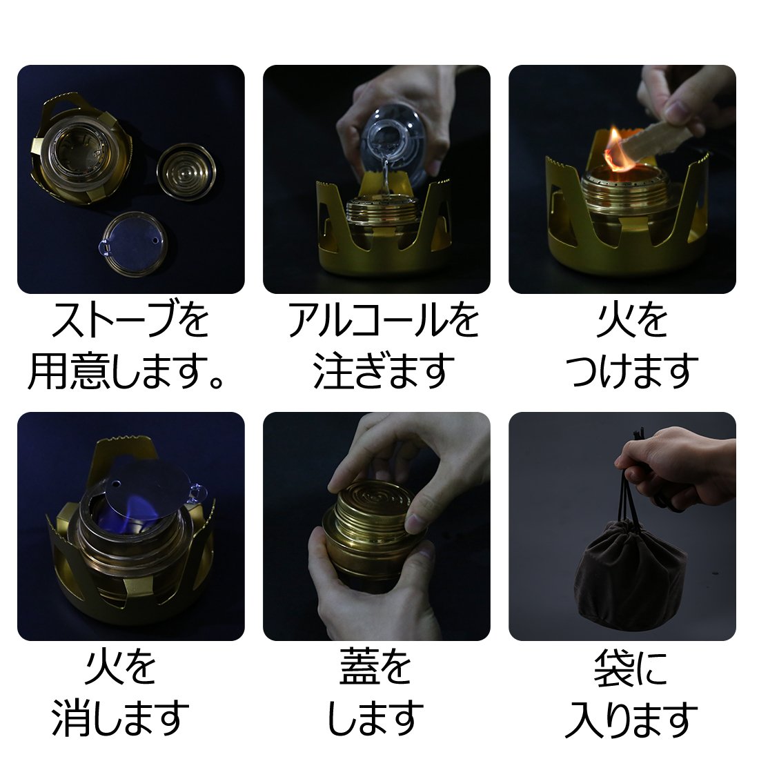 Opened after arrival. I purchased it while preparing variously for emergency use and saw it. Not to be driven by necessity, just in case. So ... it is hard for me to have no instructions! Do not forget to use it, so I regret to use it so I will use it once. As a principle, it is on how many photos of Amazon's photos. Heating alcohol → vaporizing → burning? Why do you heat it? Bonfire? That does not make sense! It is quite interesting to do exactly what it means ... after a long time doing things! That's cured by yourself. In the first place, it seems that aluminum cans can be easily done, the structure is simple and it is hard to break, so even if it can be a little rough, I think that this item has no problem. By the way ... if you want to boil 200 ml of water, it is 10 to 20 cc, if it is 500 ml it is around 30 to 50 cc. In the case of rice cooking, it is OK if burning time is about 12 minutes. It is a thing. Even so ... I'd like to have instructions.