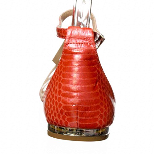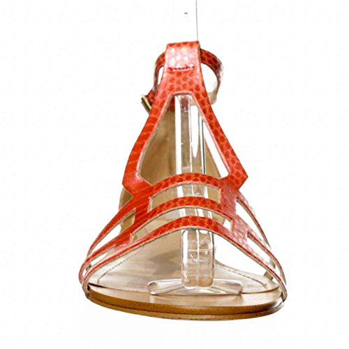 - Feature : Man-made sole / Snake-embossed leather / Round open-toe flat sandals with strappy vamp / Wrap-around ankle strap enclosure with adjustable side buckle / 4/10" covered mini wedge heel